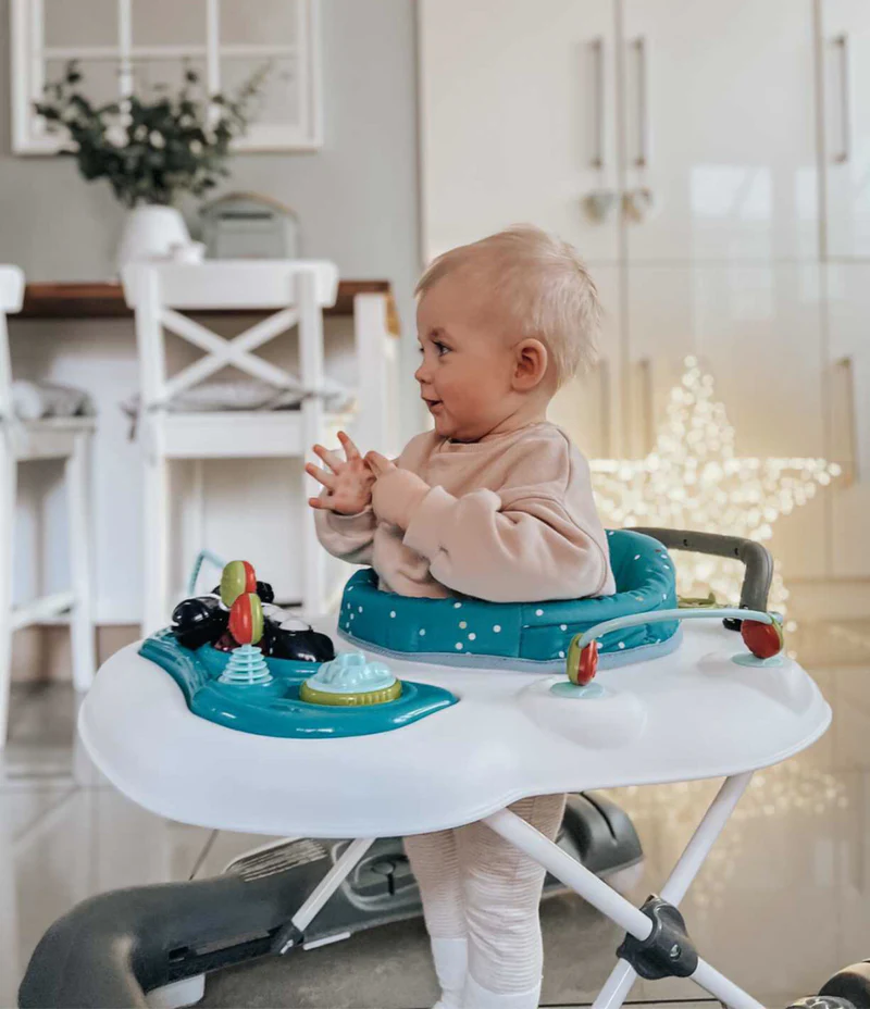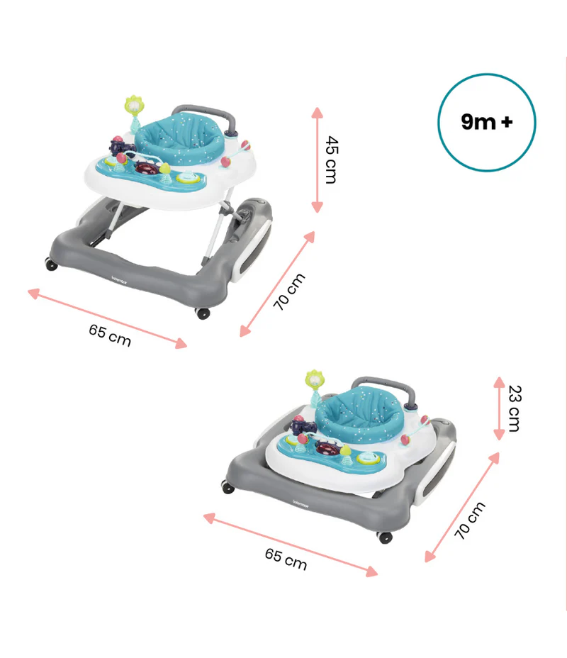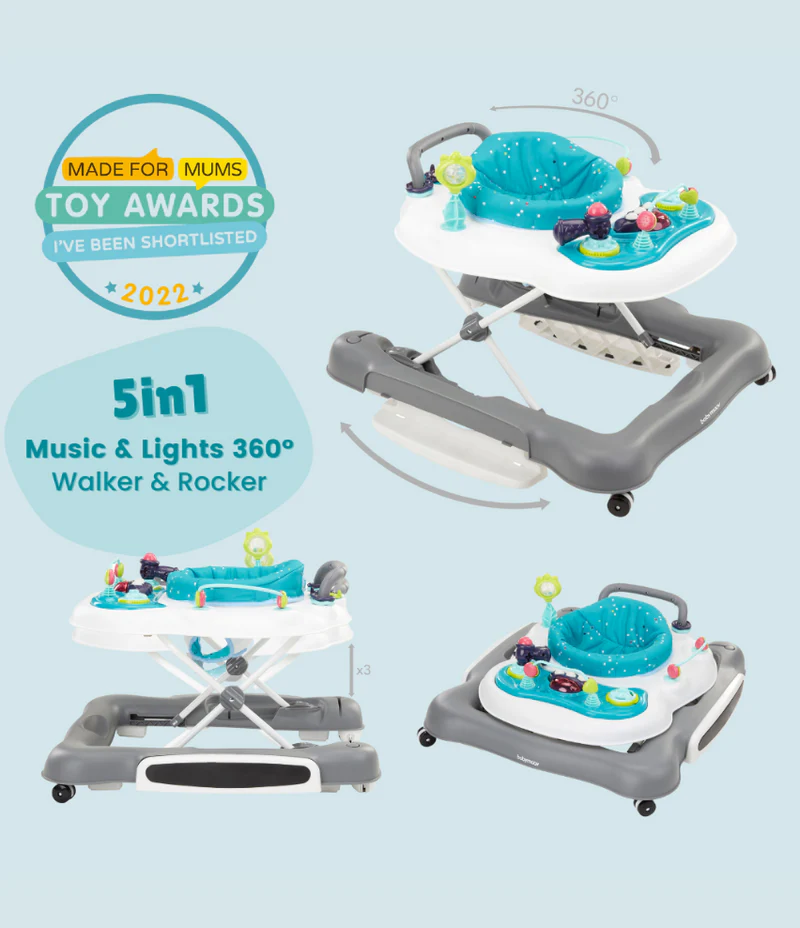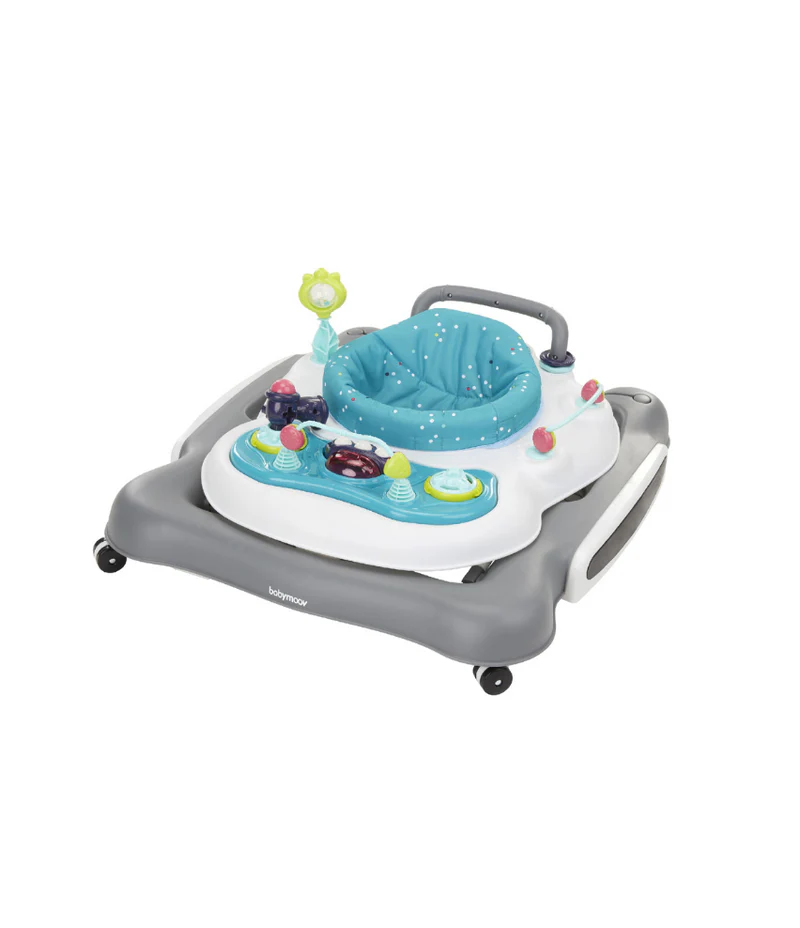The Babymoov 5-in-1 walker is designed to encourage play and promote your baby’s independence. It is a walker, push toy, rocker, 360° seat, and play pen all in one. Suitable from 6 months.