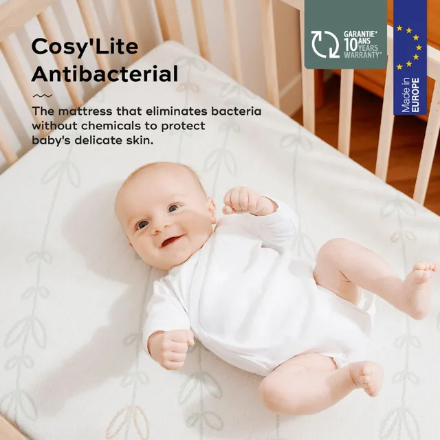 – The cover is eco-designed using organic cotton and NEWLIFE 100% recycled polyester threads. 8 plastic bottles were recycled to produce 1 mattress cover. As well as reducing the amount of plastic waste, less energy is used in producing the Antibacterial mattress Cosy’Lite : a great way to look after our planet!