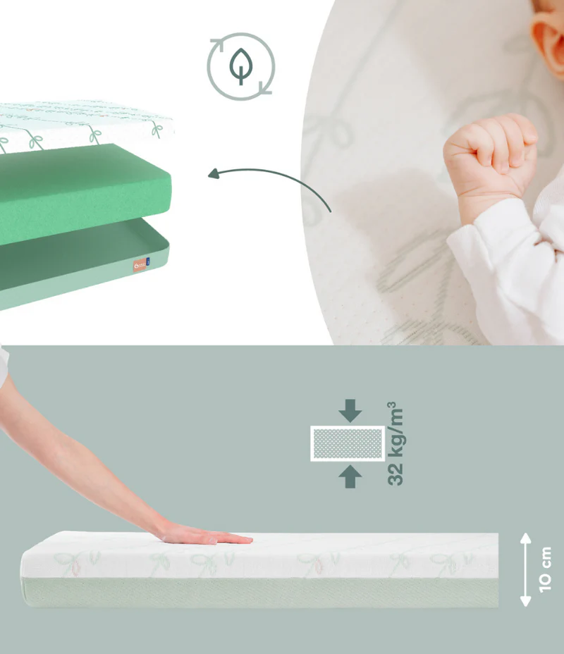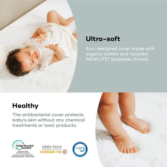 With a density of over 32kg/m3, it provides the ideal level of firmness to ensure your baby thrives. Its super soft cover is perfect for your baby’s sensitive skin, made from organic cotton and NEWLIFE (TM) 100% recycled polyester.