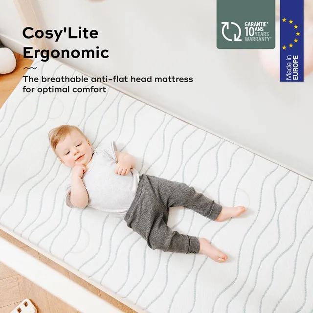 Our Cosy’Lite mattress is made from bubble foam with a thickness of 10cm. These bubbles reduce pressure on your baby’s head to prevent flat head syndrome and promote peaceful, restful sleep. They also ensure good ventilation and excellent support for your child’s spine.