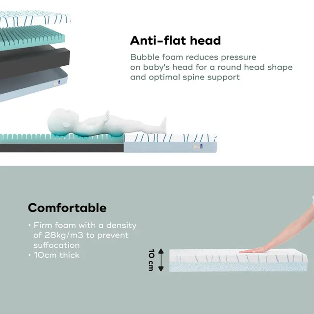 Its high density of 28kg/m3 means that baby does not sink into the mattress, for maximum comfort and safety during sleep.